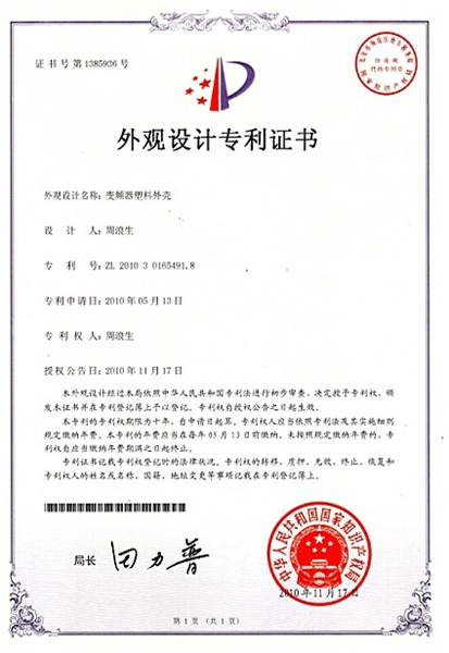 嘉善一川电子科技有限公司申请的变频器塑料外壳知识产权专利证书下来了
